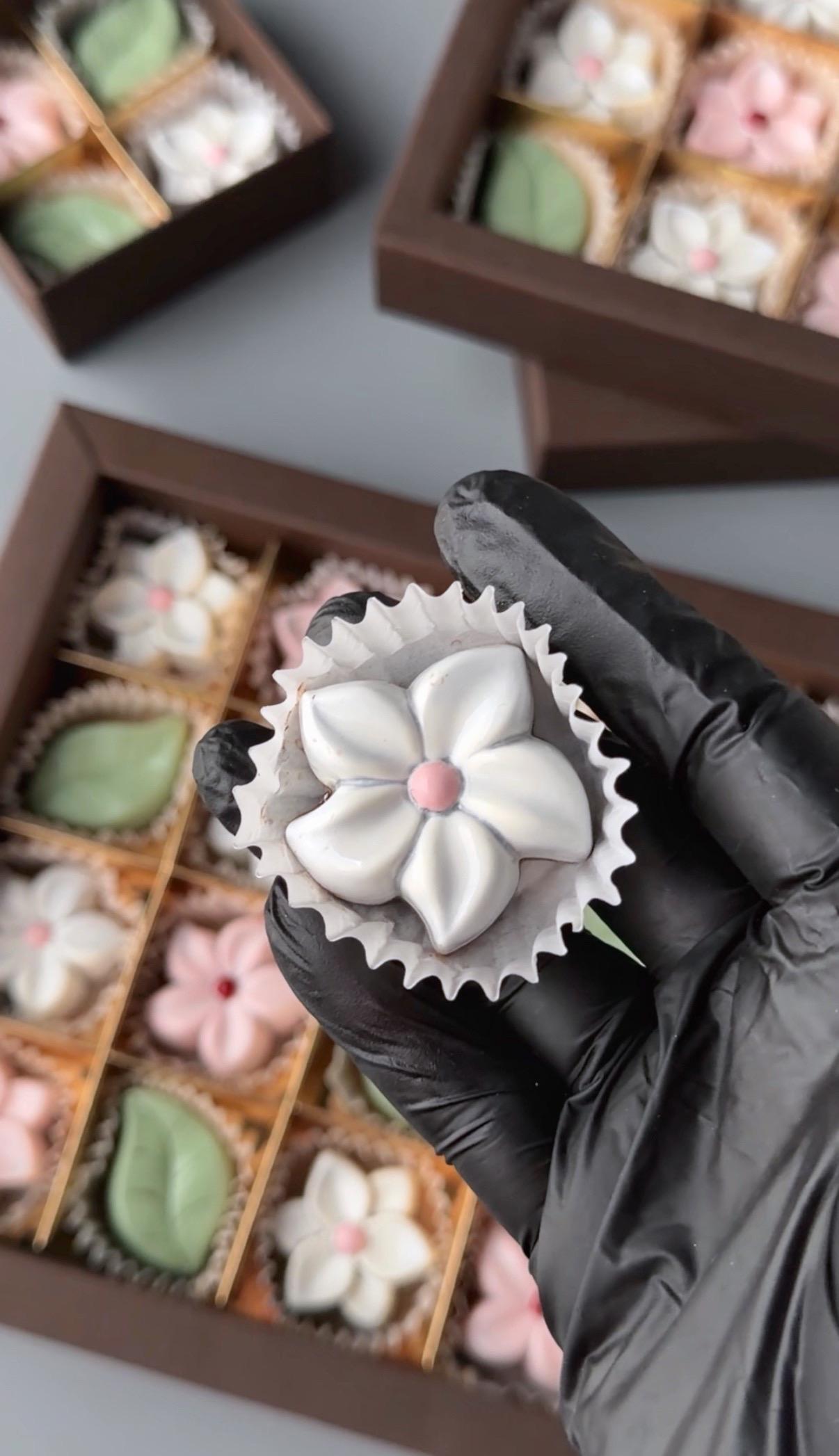 Набор шоколадных конфет в цветочной тематике. Корпус из тёмного французского шоколада. Внутри конфет начинки со вкусами: малина, ваниль, шоколад.