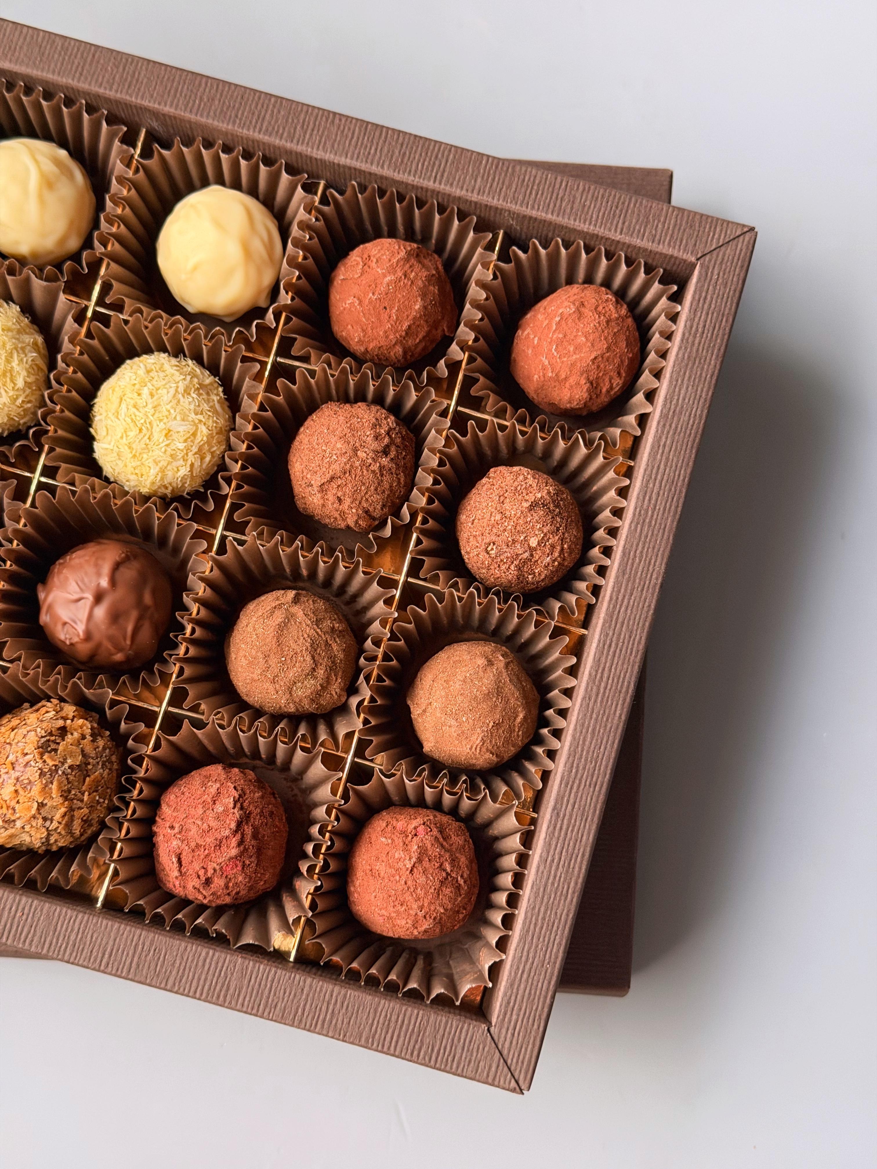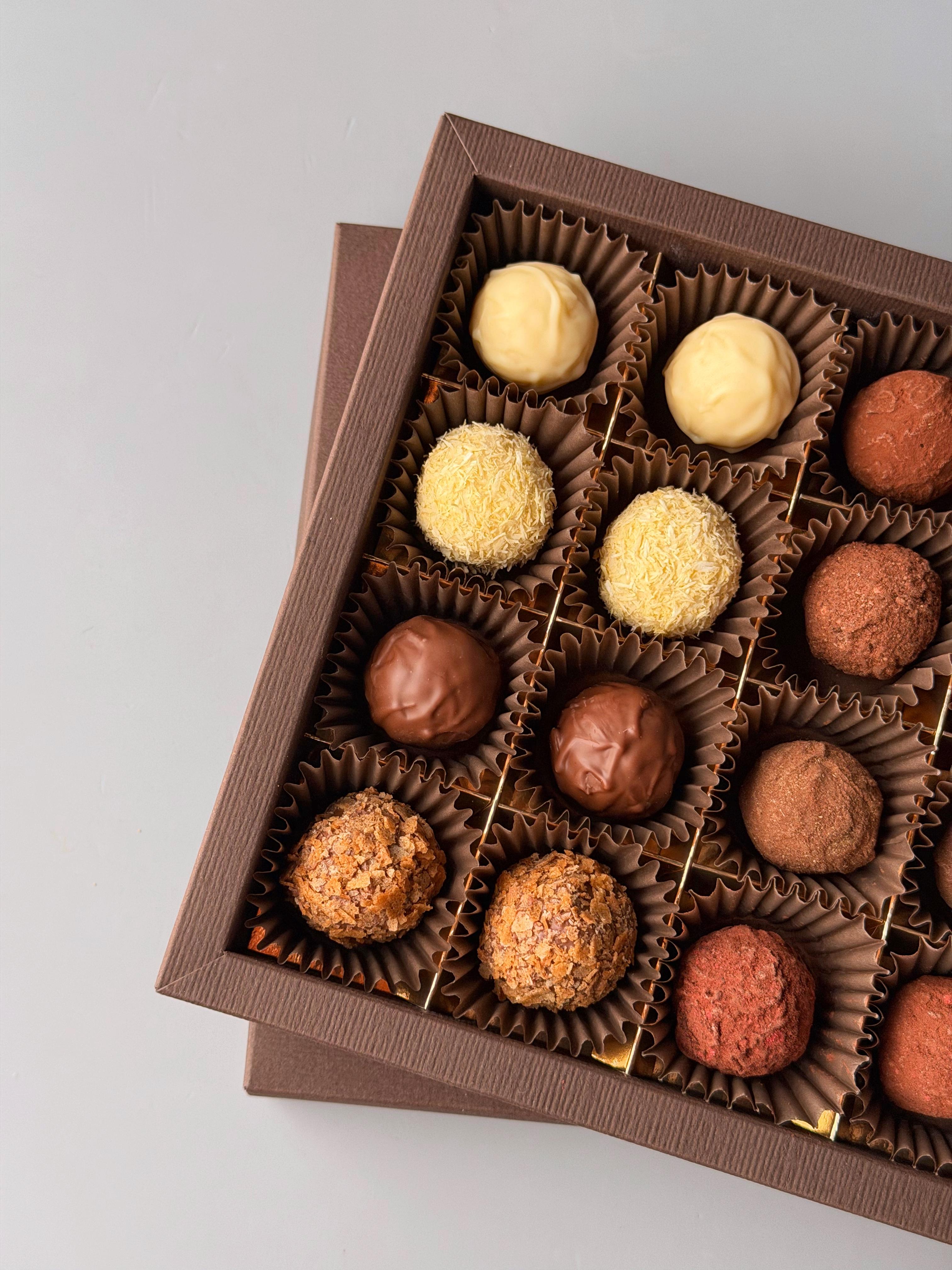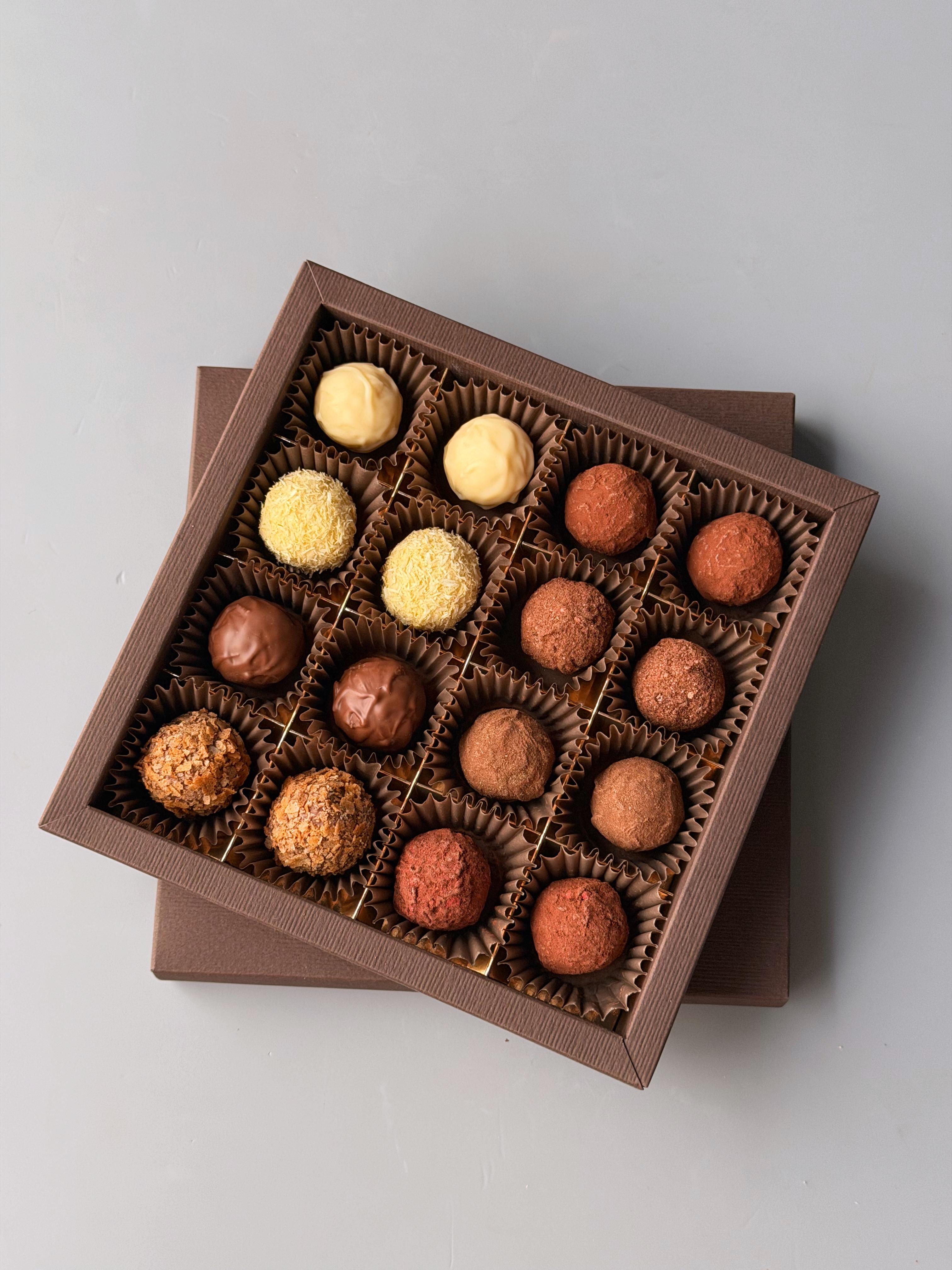 Дегустационная коробка конфет - 16 трюфелей. В наборе собраны самые популярные среди наших клиентов 8 вкусов трюфелей: * классический шоколадный, * фундучный, * манго-маракуйя, * груша-юдзу, * латте, * розмарин, * малина, * тёмный апельсин. Такая коробка конфет - идеальный вариант для знакомства с нашими конфетами, а также подходит для подарка. * Внешний вид конфет в наборах может отличаться от варианта, представленного на фото. Уточняйте у менеджера.