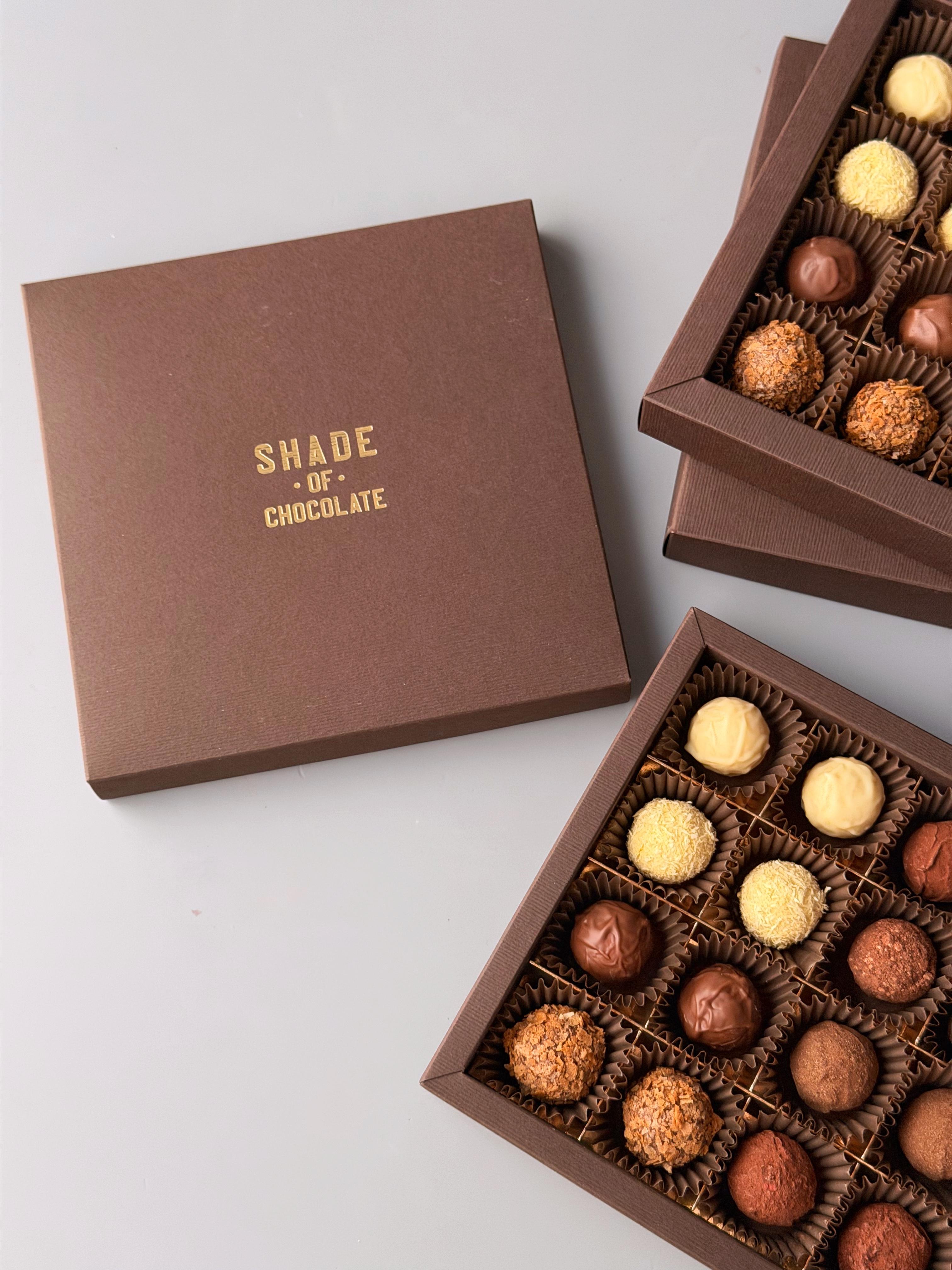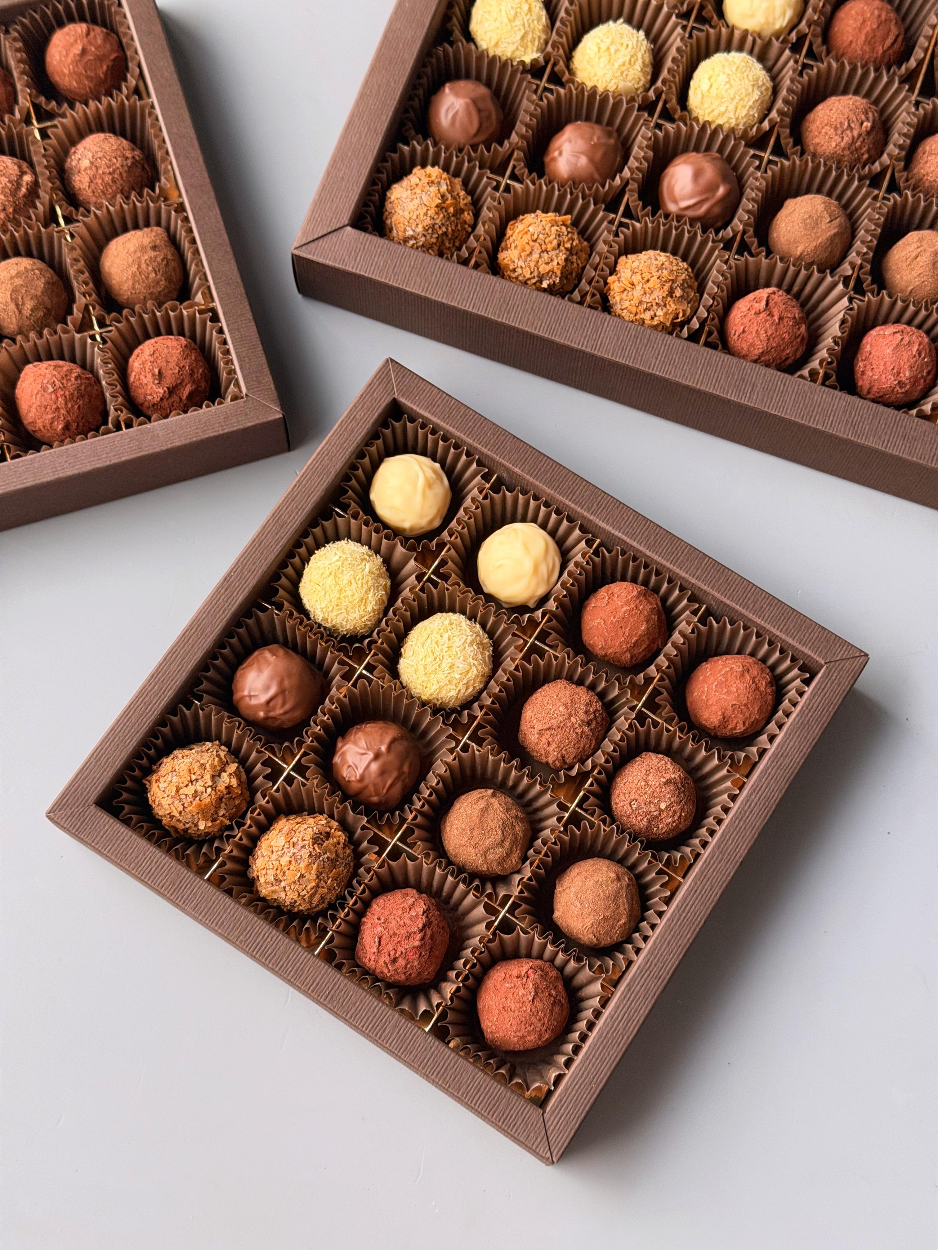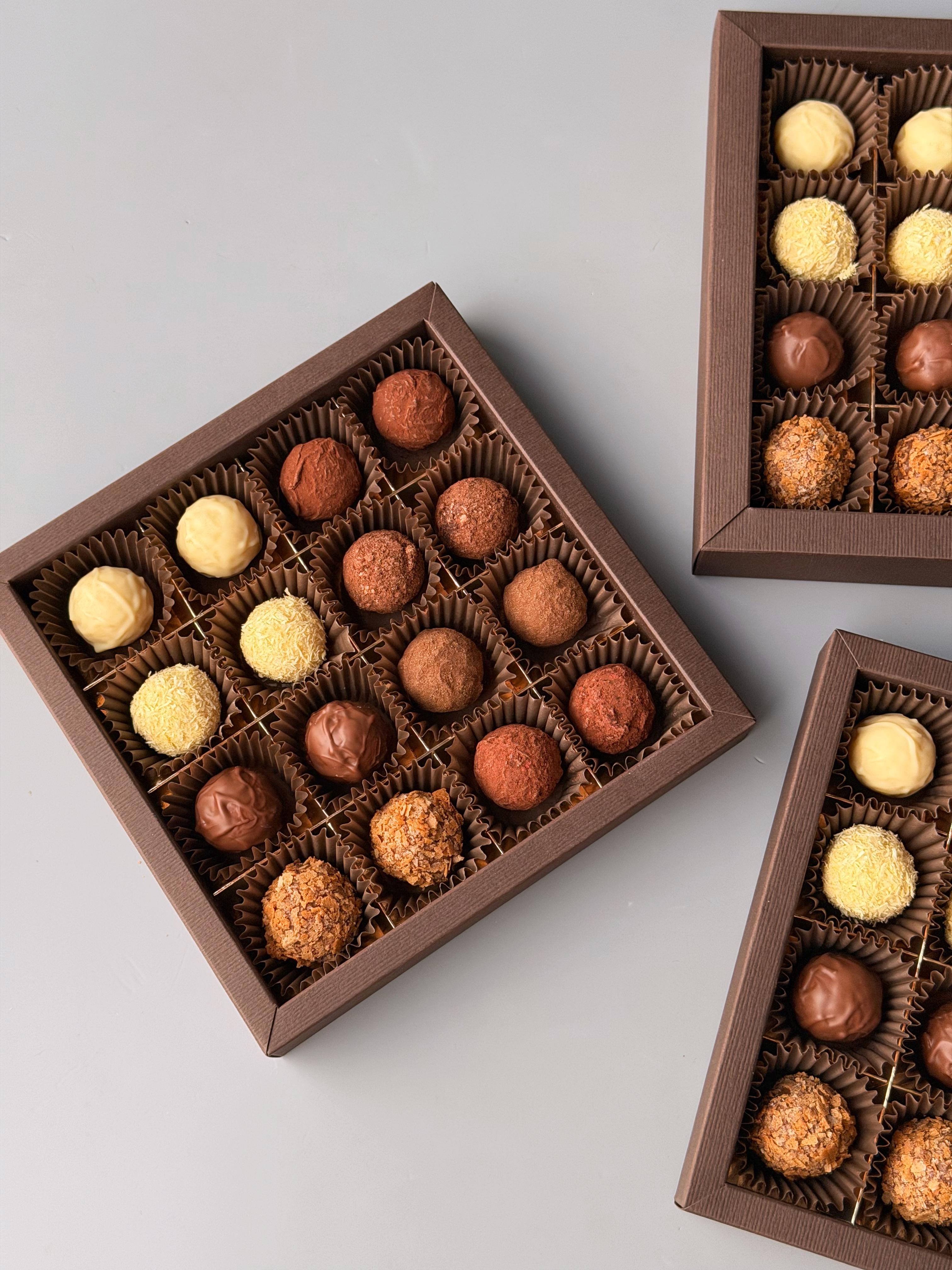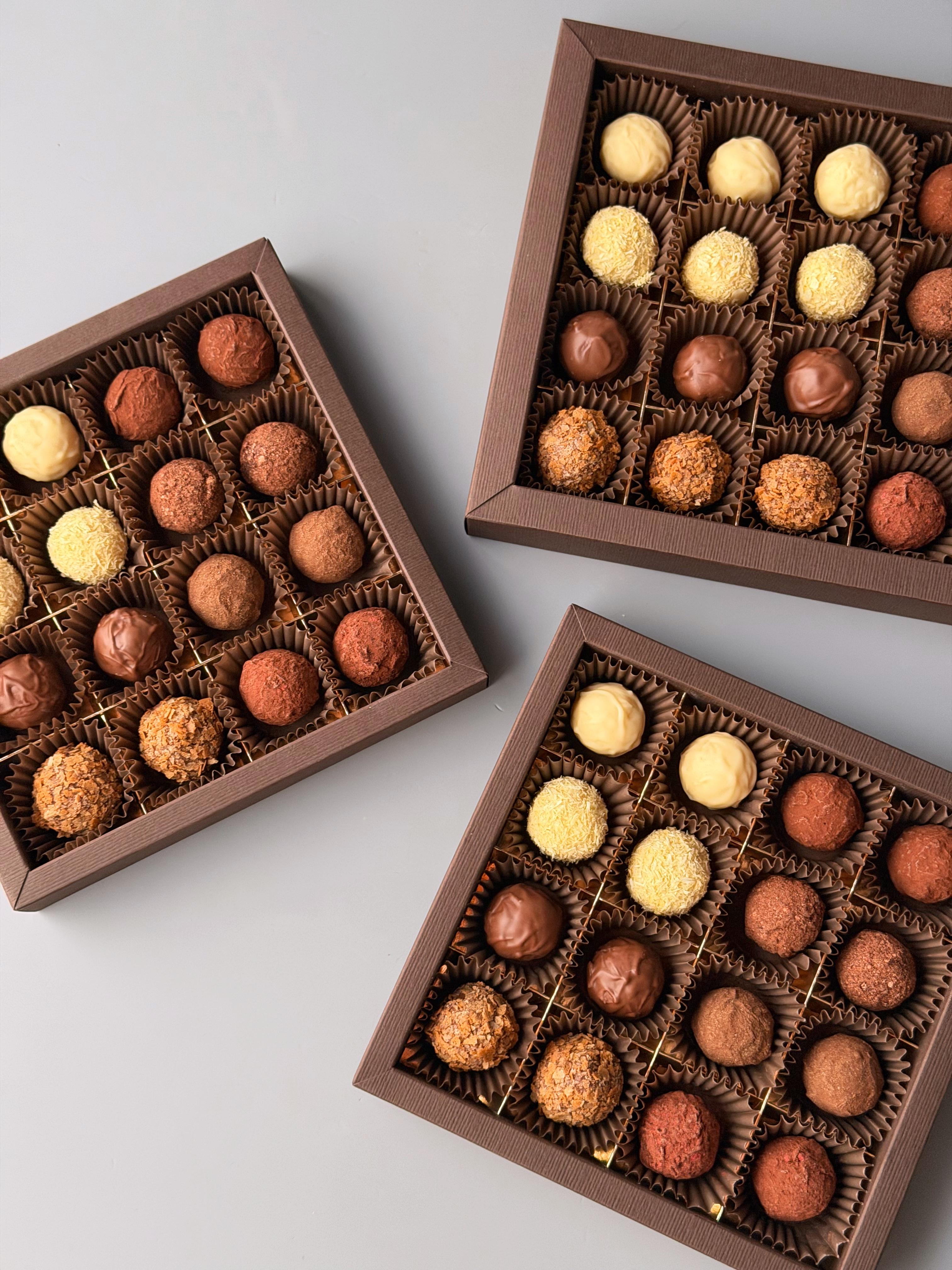 Дегустационная коробка конфет - 16 трюфелей. В наборе собраны самые популярные среди наших клиентов 8 вкусов трюфелей: * классический шоколадный, * фундучный, * манго-маракуйя, * груша-юдзу, * латте, * розмарин, * малина, * тёмный апельсин. Такая коробка конфет - идеальный вариант для знакомства с нашими конфетами, а также подходит для подарка. * Внешний вид конфет в наборах может отличаться от варианта, представленного на фото. Уточняйте у менеджера.