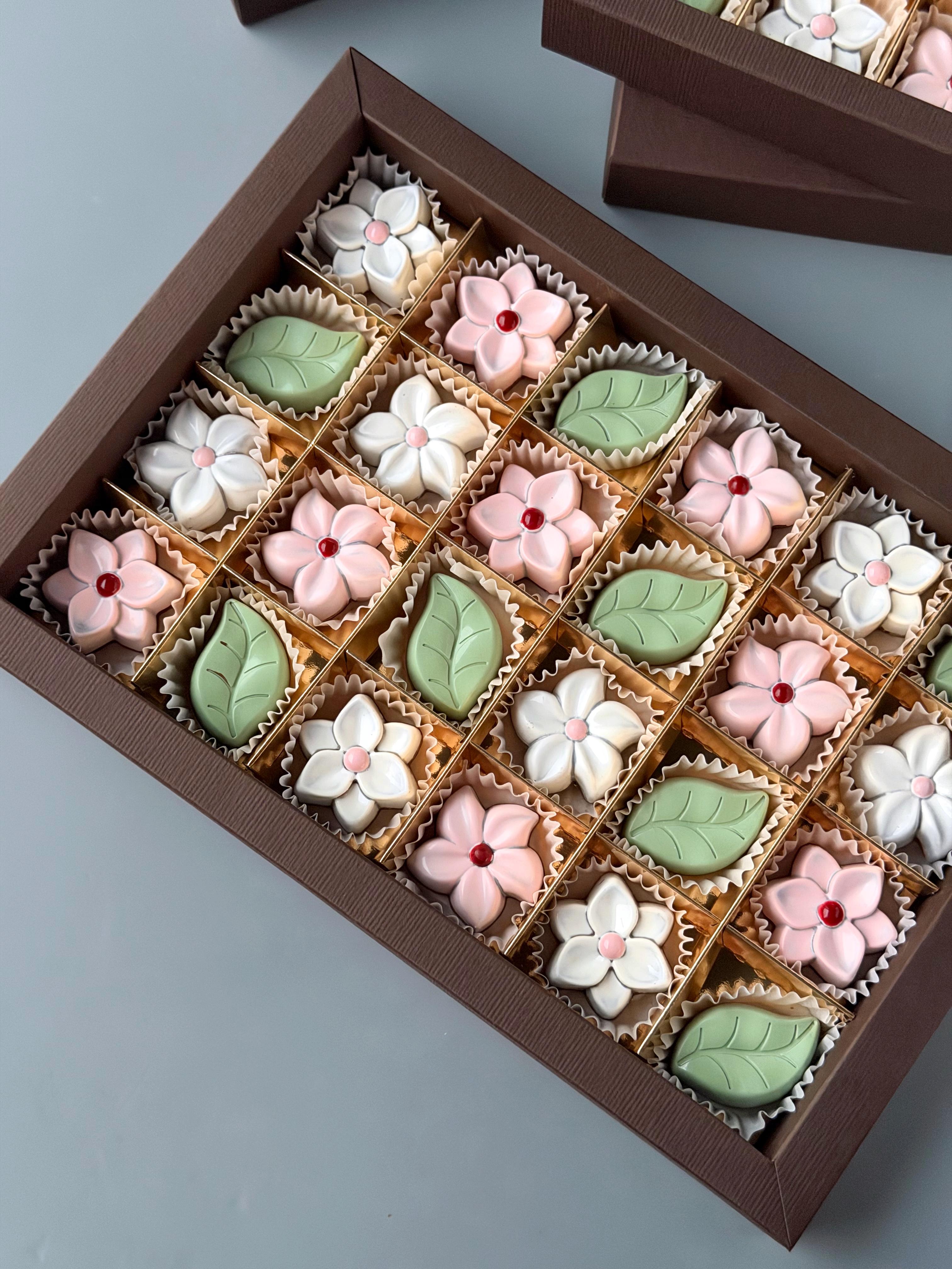 Набор шоколадных конфет в цветочной тематике. Корпус из тёмного французского шоколада. Внутри конфет начинки со вкусами: малина, ваниль, шоколад.