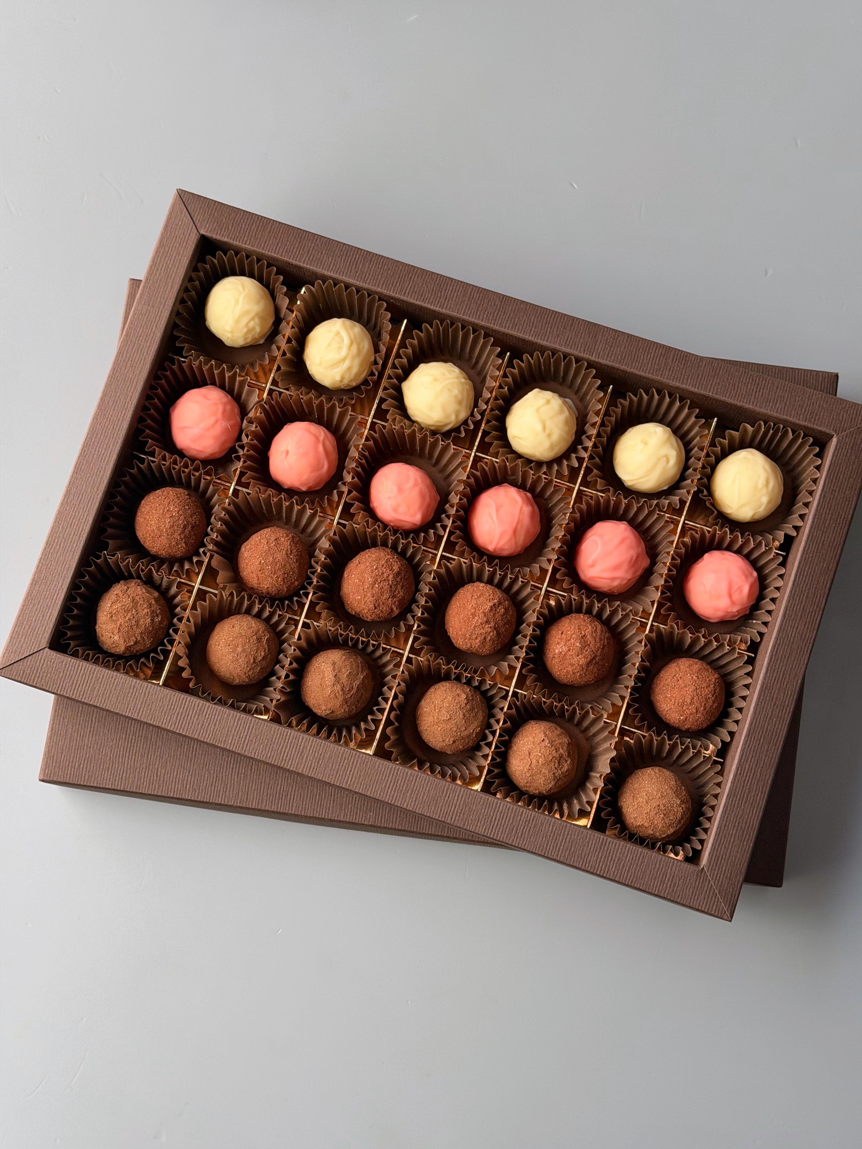 Набор на 24 конфеты. В составе набора - 4 вида шоколадных трюфелей с цитрусовыми нотами во вкусе: - Мята-лайм; - Грейпфрут; - Пихта-цитрус; - Тёмный апельсин. Для изготовления используются разные виды французского шоколада - белый, молочный и тёмный.